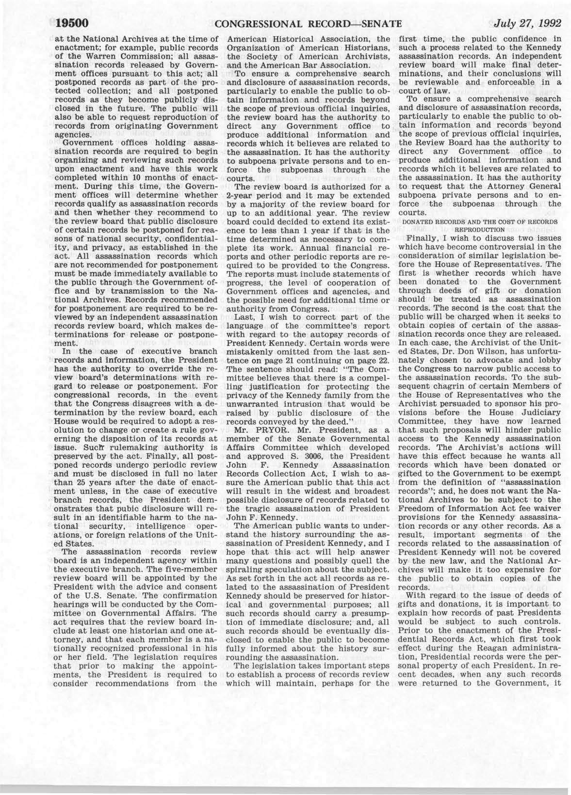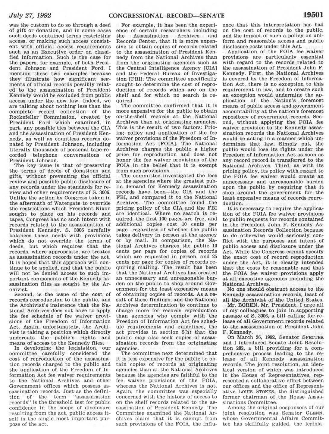 In this amendment was a section on periodic review. Larry also wants people to go look at the Rep. Louis Stokes papers, he was from Ohio too, and Sen. David Boren’s papers, he was from Oklahoma and Rep. Jack Brooks, from Texas. They all played a part in the creation of the bills and then the legislation that became the JFK Act.