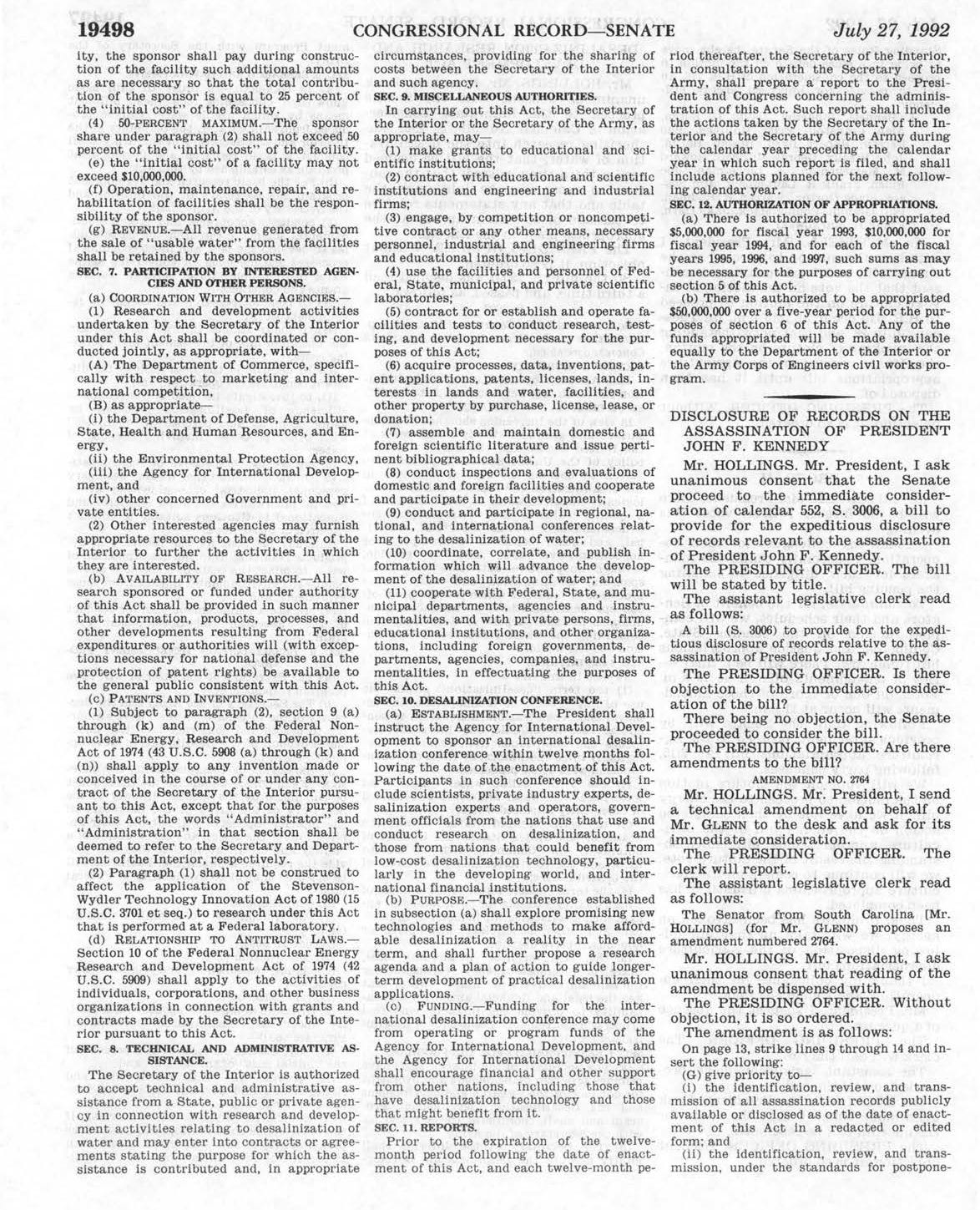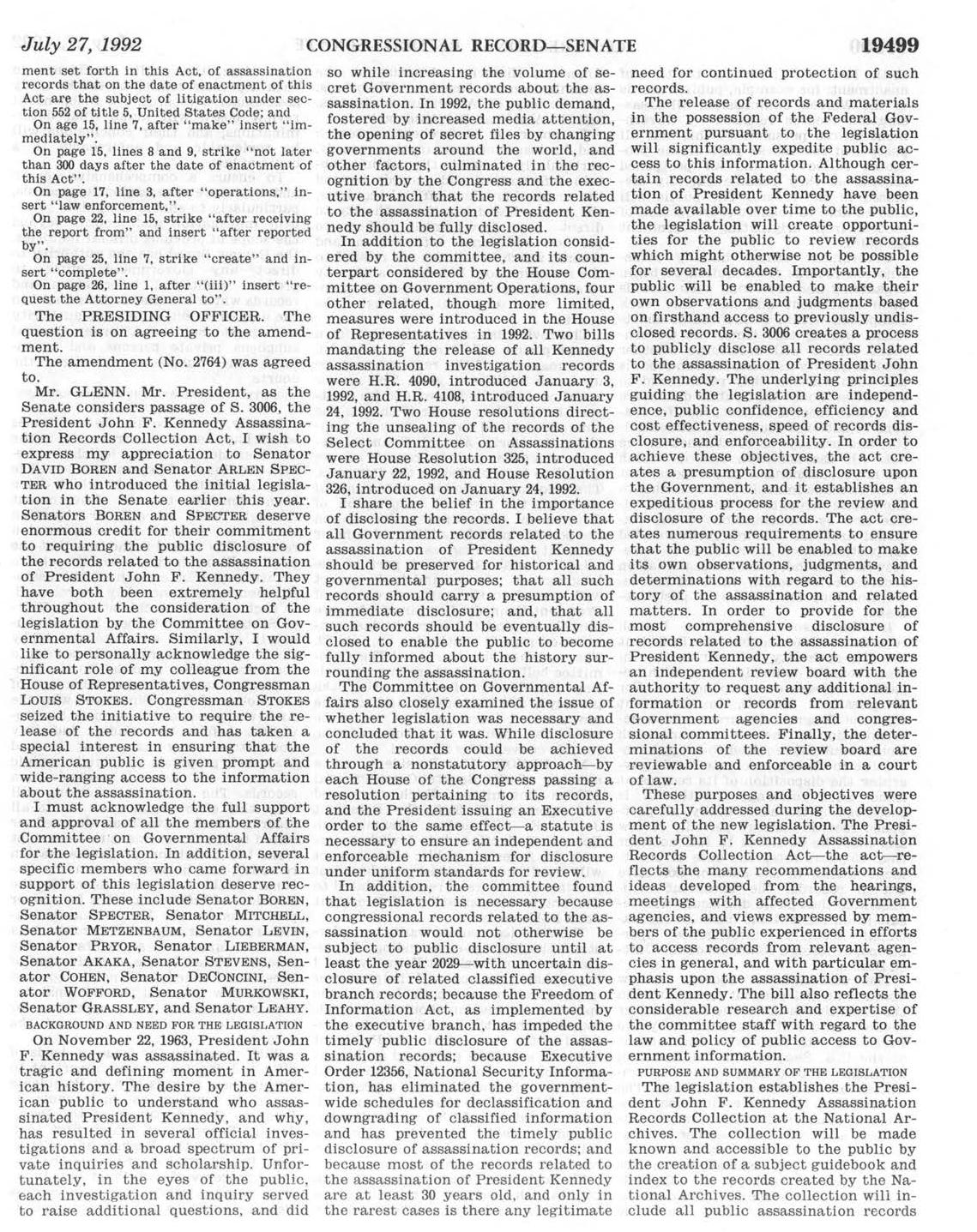 So, Larry now wants to send people on a wild goose chase. He wants to send someone to go to Columbus Ohio, to look through the late Senator John Glenn’s papers. Why? Well, once upon a time the House and the Senate had separate bills on declassifying JFK assassination records. In 1992 the DOJ objected to the creation of the ARRB. So, according to Larry, John Glenn authored an amendment. But, it looks to me like Sen Ernest Hollings wrote it and Sen. Glenn sponsored it. It’s S. Amdt. 2764 to S.3006.